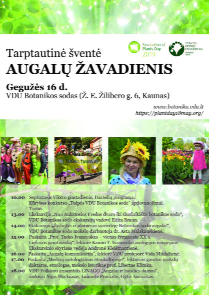 Tarptautinė šventė AUGALŲ ŽAVADIENIS. Vytauto Didžiojo universiteto Botanikos sodas, nacionalinis tarptautinio renginio „Augalų žavadienis“ koordinatorius Lietuvoje, kviečia į penkioliktąjį tarptautinį renginį „Augalų žavadienis“ 2019 (FoPD 2019). Europos augalų tyrimų organizacijos (EPSO) inicijuojamas renginys suvienija viso pasaulio augalų tyrėjus, skatina sužadini norą kuo daugiau žmonių visame pasaulyje gėrėtis augalais ir priminti jų svarbą mokslui, žemės ūkiui, tvariai visuomenei, sodininkystei, miškininkystei ir kitoms sritims, nebūtinai susijusioms su maisto pramone.