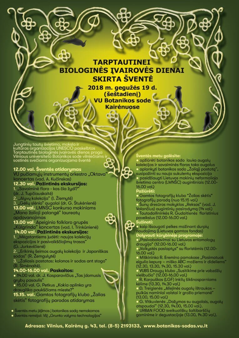 2018 m. gegužės 19 d., šeštadienį, 12.00 val. kviečiame į Tarptautinę biologinės įvairovės dienos šventę, kuri vyks VU Botanikos sode Kairėnuose.